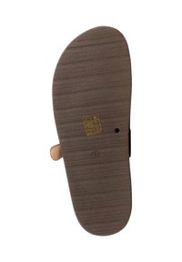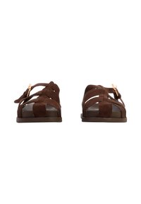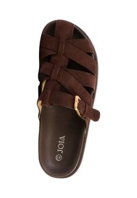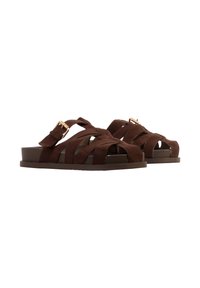 Sandale slide marron avec des brides croisées en suède et une boucle dorée sur une semelle plate, vue de profil.