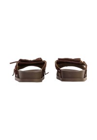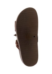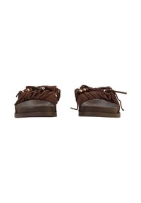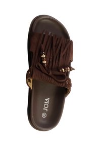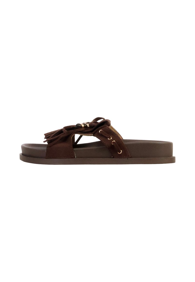 Sandale plate marron avec de larges brides en daim, anneaux dorés et pampilles décoratives, montrée de profil sur fond blanc.