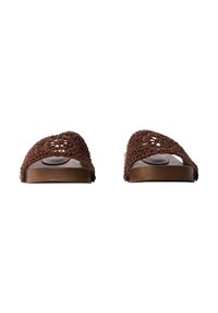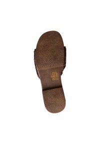 Sandale marron à glissière avec un petit talon en bois, dessus en crochet et clous en laiton le long du côté de la semelle.