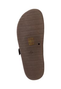 Sandale noire ouverte à l’avant type slide avec trois larges brides, dont une avec une petite boucle dorée, et une semelle plate marron.
