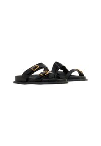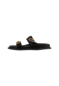 Sandale plate noire à enfiler avec deux brides réglables ornées de boucles dorées, vue de profil sur fond blanc.