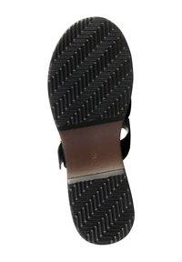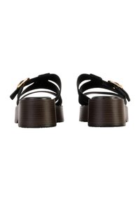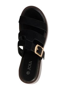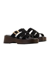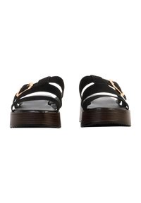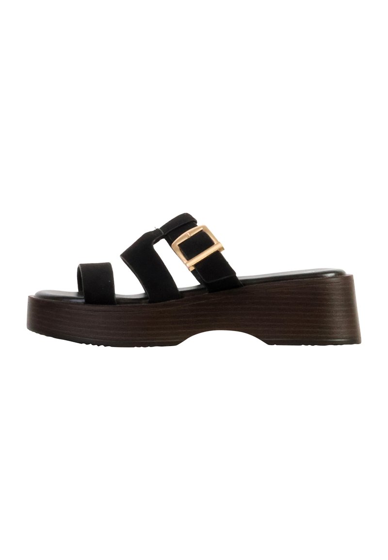 Sandale à plateforme noire avec trois brides, dont une avec une boucle dorée, et une semelle marron texturée avec une légère cambrure.