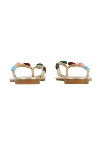 Sandale plate dorée avec pierres décoratives multicolores et petites perles dorées sur les brides, sur fond blanc.