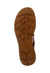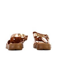 Sandale en cuir métallisé or rose avec brides croisées, boucle réglable et semelle plate rembourrée pour un usage décontracté.