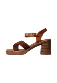 Sandale à talon marron avec des brides croisées dorées à l'avant et une boucle cheville sur un talon bloc empilé, vue de côté sur fond blanc.
