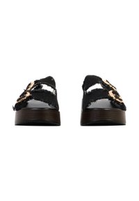 Sandale à plateforme noire avec deux lanières en tissu effiloché et boucles dorées, dotée d’une semelle à texture bois et d’une légère découpe à la voûte plantaire.