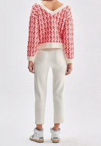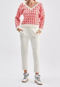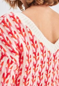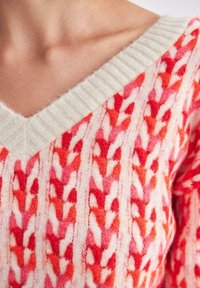 Pull en tricot couleur crème, présentant un motif audacieux rouge et rose. Col en V avec poignets et ourlet côtelés, silhouette carrée.