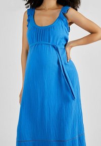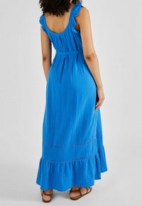 Robe maxi bleue avec bretelles volantes, corsage froncé et ourlet à volants. Fabriquée en tissu léger, elle présente un lien sur le côté et une texture lisse.