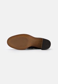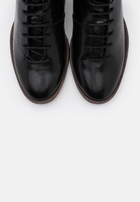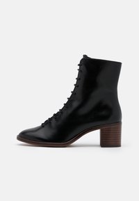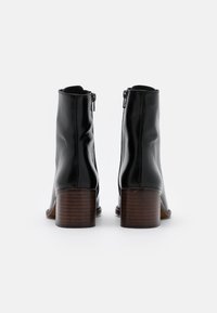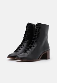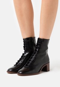 Bottes de cheville en cuir noir à lacets avec fermetures éclair sur le côté et talons carrés, portées sur des jambes nues sur un fond blanc.