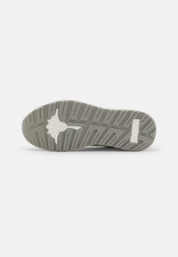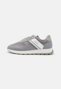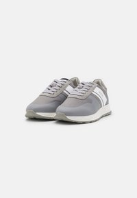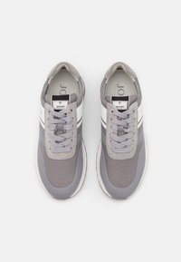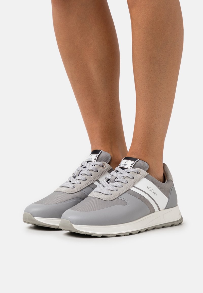 Personne portant des baskets JOOP! gris et blanc avec des lacets, debout sur une surface blanche.