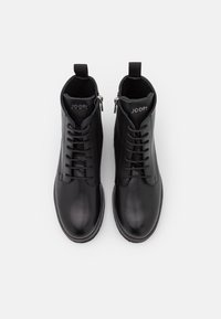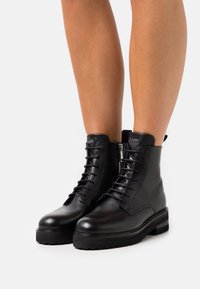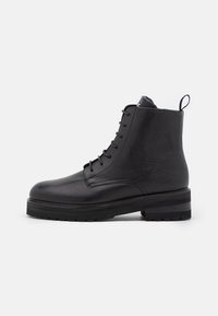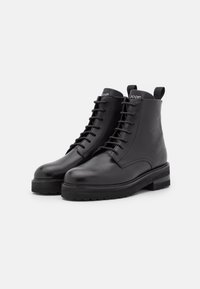 Bottes en cuir noir pour la cheville, avec bouts ronds, lacets à l'avant et fermetures éclair sur le côté. Elles ont une semelle texturée et le logo de la marque sur la cheville.