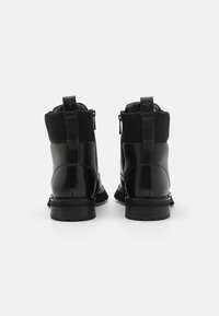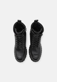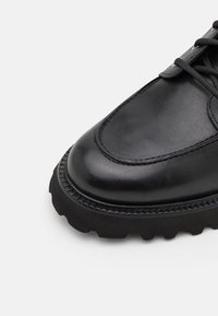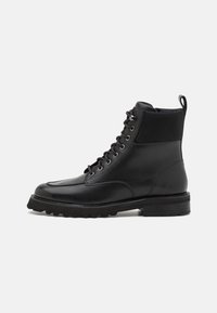 Bottine en cuir noir à lacets, avec col rembourré, semelle robuste et languette d'extraction, vue de côté extérieur sur fond blanc.
