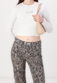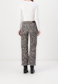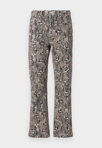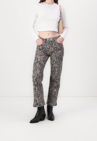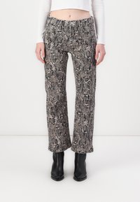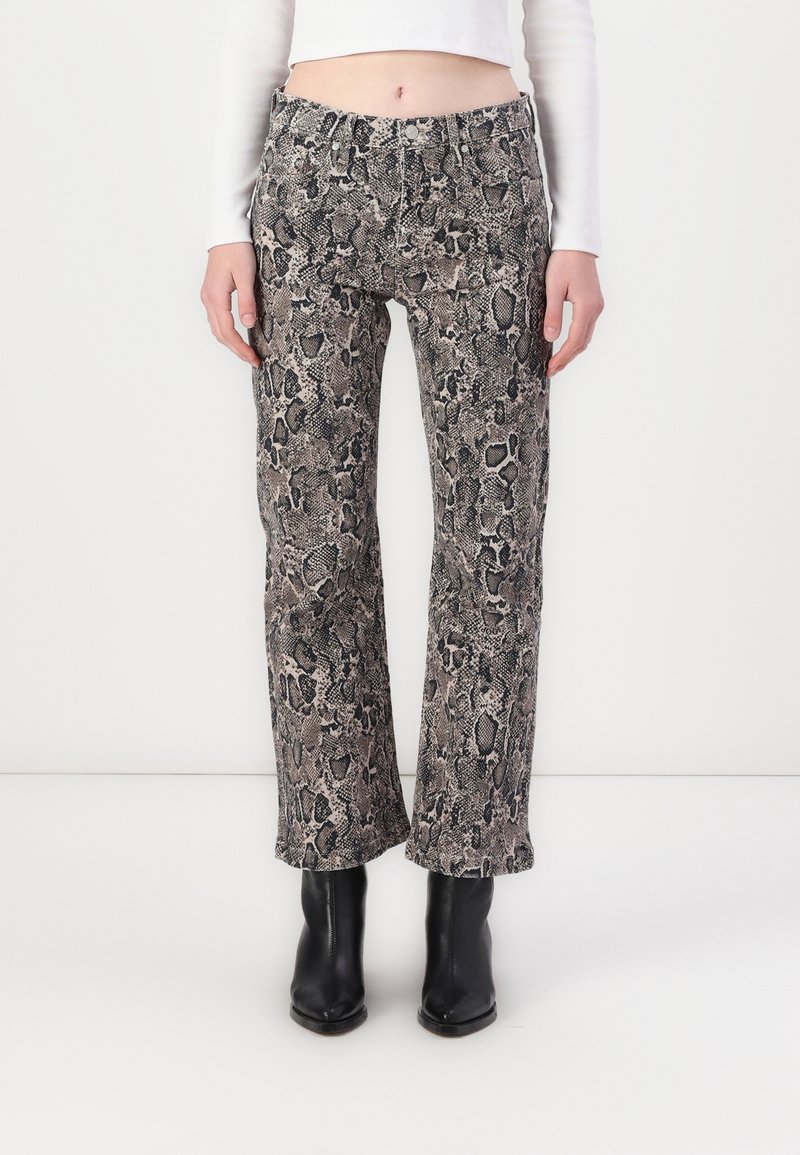 Pantalon imprimé serpent dans une palette de couleurs sobres, avec une coupe droite, un design à cinq poches et une texture de tissu lisse. Bottines noires.