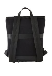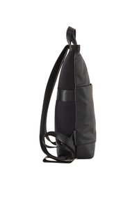 Sac à dos rectangulaire noir avec poignée supérieure, poche avant et logo "J!" embossé discret dans le coin inférieur droit.