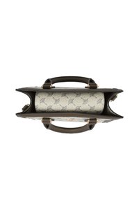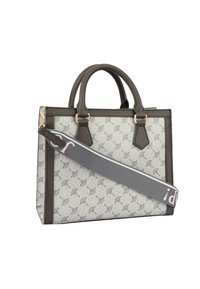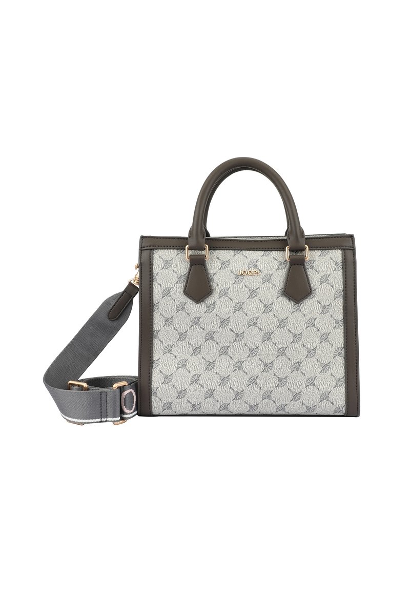 Sac à main rectangulaire à motif gris avec poignées marron foncé, garniture et bandoulière grise ajustable, marqué d'un petit logo doré "JOOP!".
