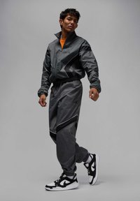 Jeune homme en survêtement sportif gris et noir avec des baskets blanches et noires posant devant un fond uni gris clair.
