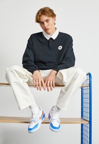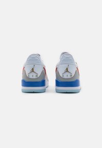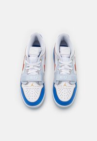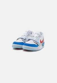 Baskets basses blanches avec le logo Nike swoosh rouge, embout et semelle bleus, et panneau talon gris, vues de profil sur fond blanc.