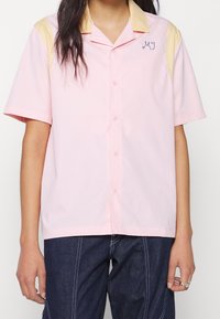 Personne portant une chemise à manches courtes, boutonnée, de couleur rose clair avec des accents jaunes sur le col et les épaules, avec les initiales brodées "MJ" sur la poitrine.