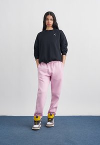 Jeune femme aux longs cheveux foncés portant un sweat-shirt noir avec logo blanc et un pantalon de survêtement rose clair, mains dans les poches, fond neutre.