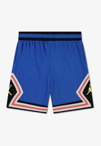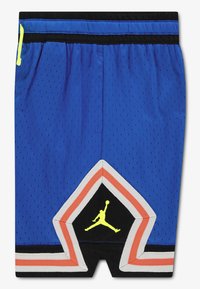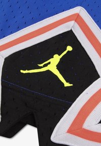 Shorts de basket-ball bleus avec des bordures en zigzag noir, blanc et orange, un cordon de serrage jaune fluo et des panneaux noirs ornés de logos Jumpman jaune fluo.