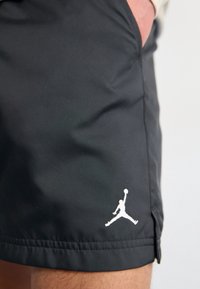Shorts de sport noirs en tissu léger, dotés d'une taille élastique et d'un logo blanc. Portés avec des chaussures noires imposantes et des chaussettes.