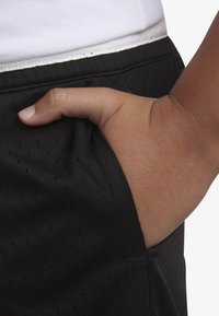 Personne portant un short de basket noir avec un bord blanc et des baskets montantes noires, blanches et rouges, debout les pieds écartés.