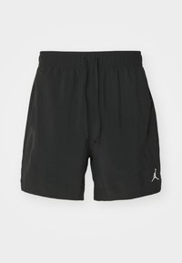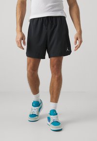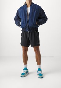 Homme portant un short noir, des chaussettes blanches de type crew et des sneakers turquoise et violet se tenant à l'intérieur sur le sol d'une salle de sport.