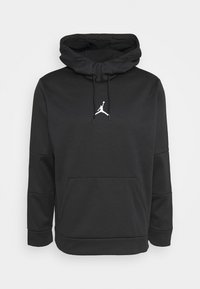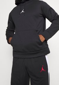 Homme portant un sweat à capuche noir avec le logo Jumpman blanc et un pantalon noir avec le logo Jumpman rouge et des bandes blanches sur les côtés. Mains dans les poches du sweat.