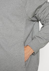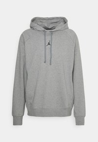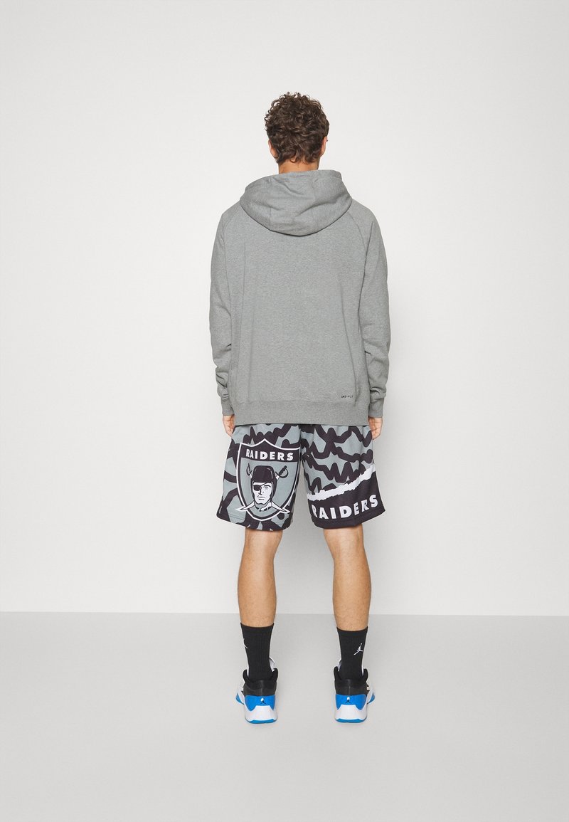 Sweat à capuche gris avec cordon de serrage, associé à un short noir et gris à motifs avec un logo des Raiders. Chaussettes noires et chaussures avec accents bleus.