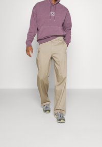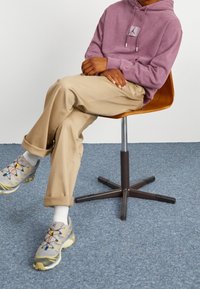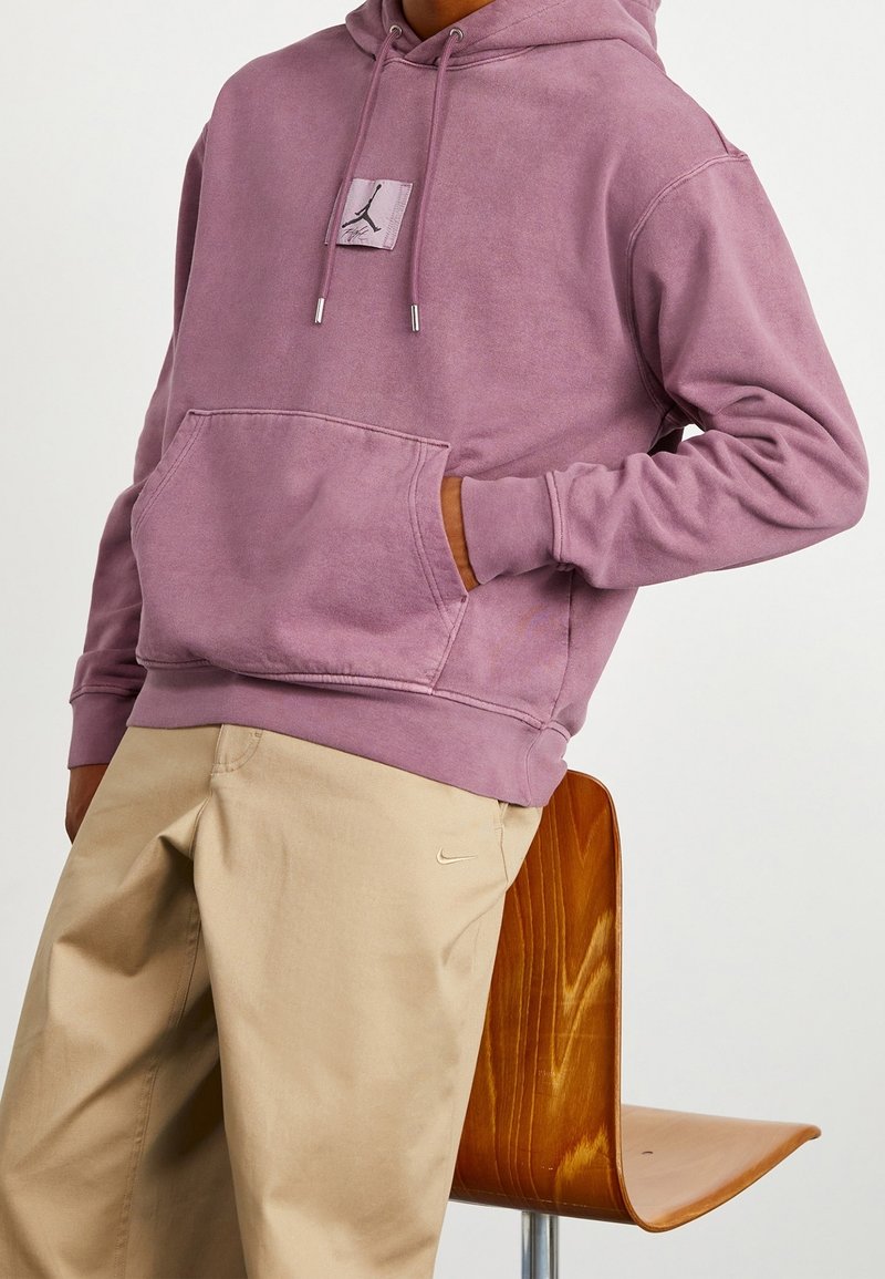 Personne portant un sweat à capuche Jordan violet et un pantalon Nike beige, appuyée contre une chaise en bois, la main dans la poche du sweat.