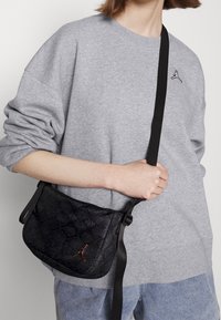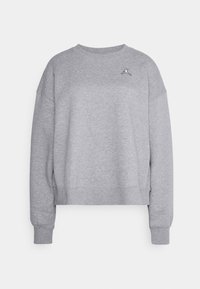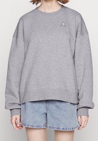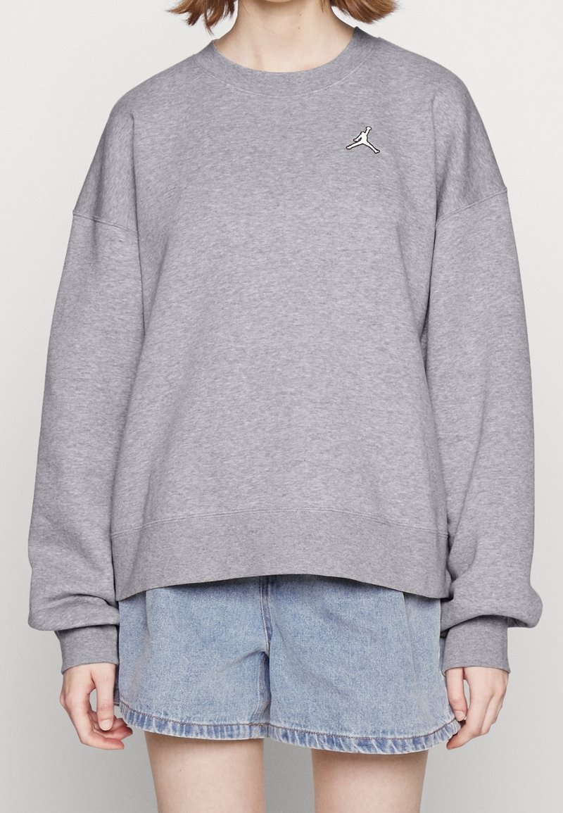 Personne portant un sweat-shirt gris ample avec un petit logo Jumpman sur la poitrine gauche et un short en jean bleu clair.