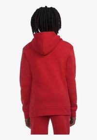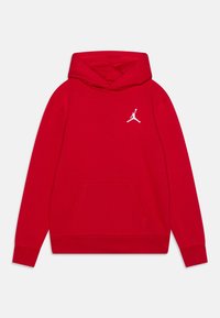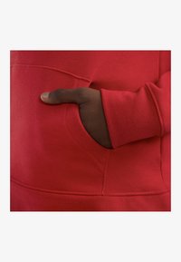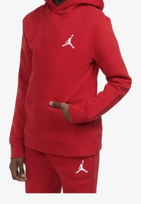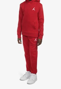 Personne portant un sweat à capuche rouge et un pantalon assorti avec des logos blancs d'un joueur de basket en saut sur la poitrine et la cuisse.