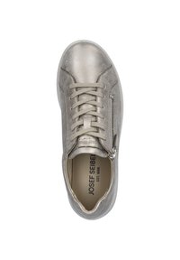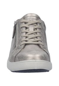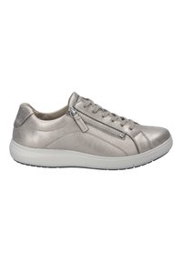 Baskets argent métallisé avec une tige en cuir lisse, un bout rond, une fermeture à lacets et une fermeture éclair latérale. Semelle en caoutchouc blanche avec des accents de traction foncés.