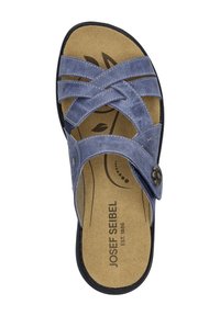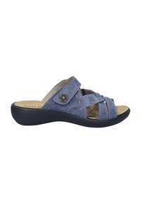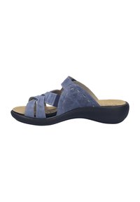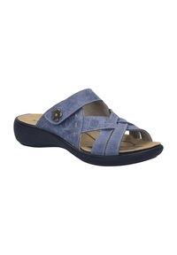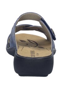 Sandale ouverte à l'avant bleu avec brides ajustables et semelle noire rembourrée, conçue pour le confort et un port décontracté.