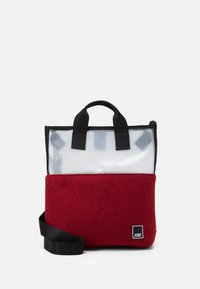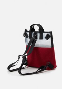 Sac cabas rouge et transparent avec des poignées et une sangle noires, arborant un logo Jost noir et blanc en bas à droite.
