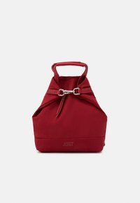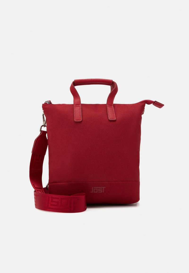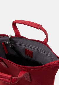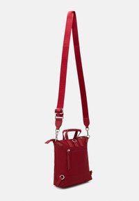 Sac bandoulière carré rouge avec poignées supérieures, bandoulière amovible, fermeture éclair et logo de marque discret en bas à l'avant.