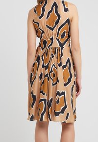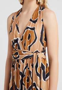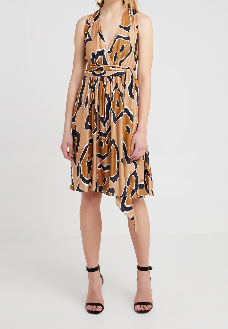 Robe portefeuille à imprimé léopard marron et noir avec un décolleté en V profond, une taille cintrée et un ourlet asymétrique, fabriquée en tissu lisse et léger.