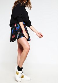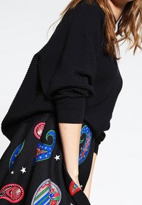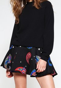 Haut noir côtelé à manches longues associé à une jupe noire évasée ornée de motifs cachemire multicolores et d'étoiles blanches.