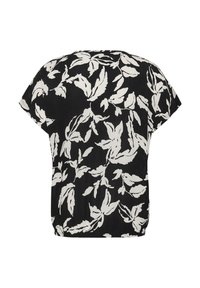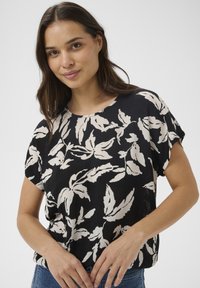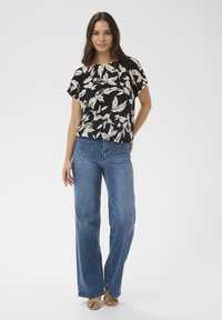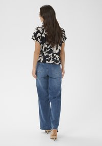 Jeune femme aux longs cheveux bruns portant un chemisier noir à motifs de feuilles beiges et un jean bleu, debout les mains derrière le dos.
