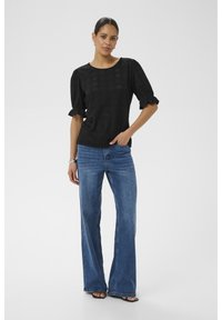 Femme portant un chemisier noir texturé à manches bouffantes, un jean bleu à jambes larges et des talons ouverts noirs, debout avec une main dans la poche.