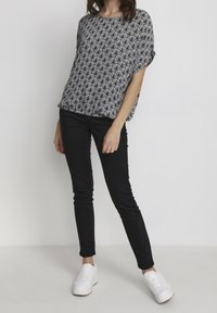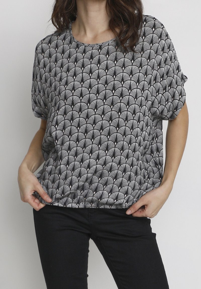 Femme portant un haut à manches courtes noir et blanc à motifs avec un col rond et un pantalon noir, debout devant un fond uni.