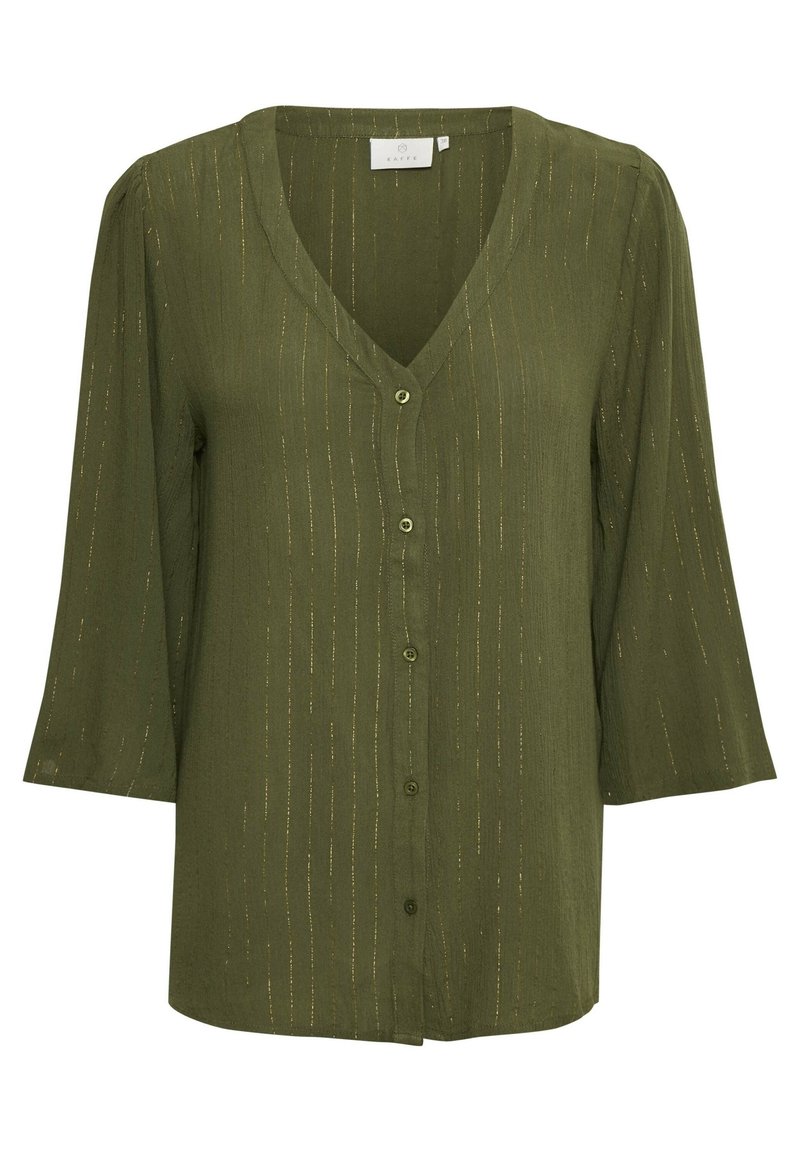 Blouse boutonnée vert olive avec fines rayures métalliques verticales, col en V et manches trois-quarts.