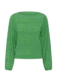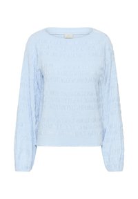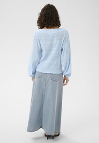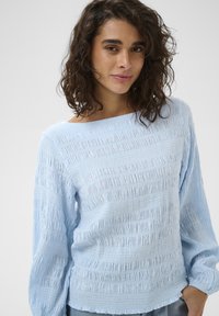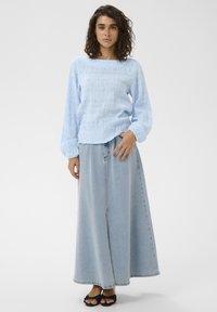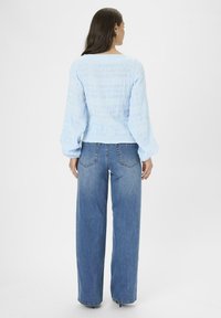 Jeune femme aux cheveux bruns bouclés portant un chemisier bleu clair texturé à manches longues et un jean en denim clair, debout devant un fond uni.