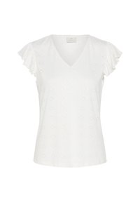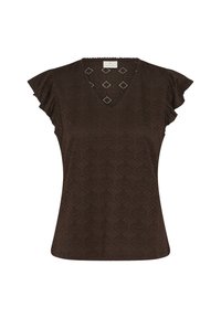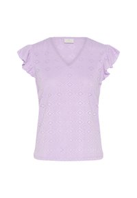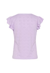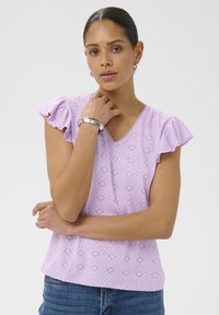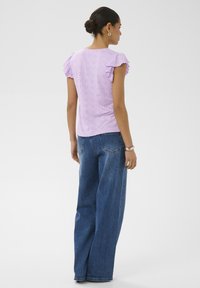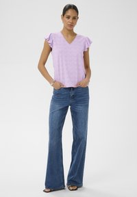 Femme aux cheveux foncés attachés en chignon portant un haut lilas à motifs avec des manches à volants, un jean bleu, un bracelet argenté et des petites boucles d'oreilles créoles.