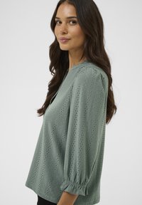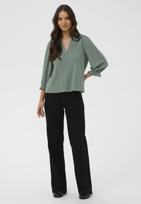 Blouse verte texturée avec détails en œillets, col en V et manches bouffantes. Associée à un pantalon foncé avec des poignets froncés.