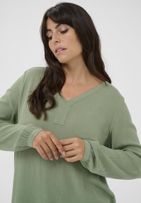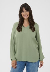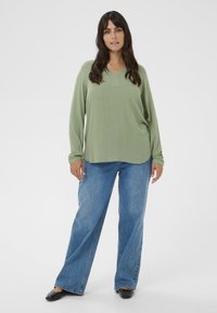 Blouse vert clair à manches longues avec un col en V et une texture subtile, associée à un jean en denim bleu. Design simple sans ornements supplémentaires.