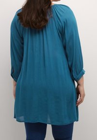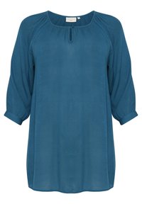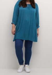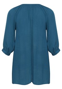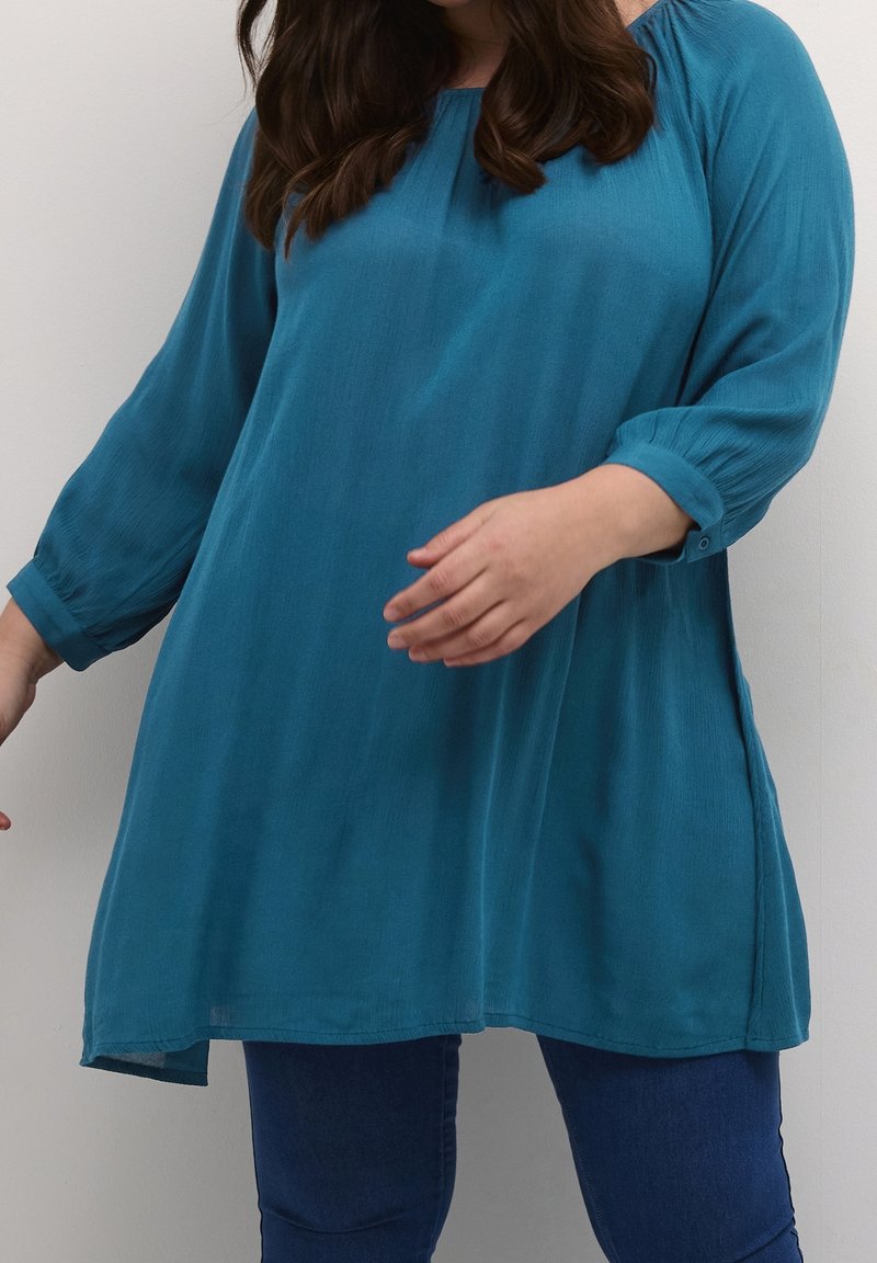 Tunique bleu sarcelle avec manches trois-quarts, encolure arrondie et fentes latérales, réalisée en tissu léger à la texture douce.