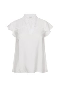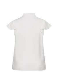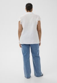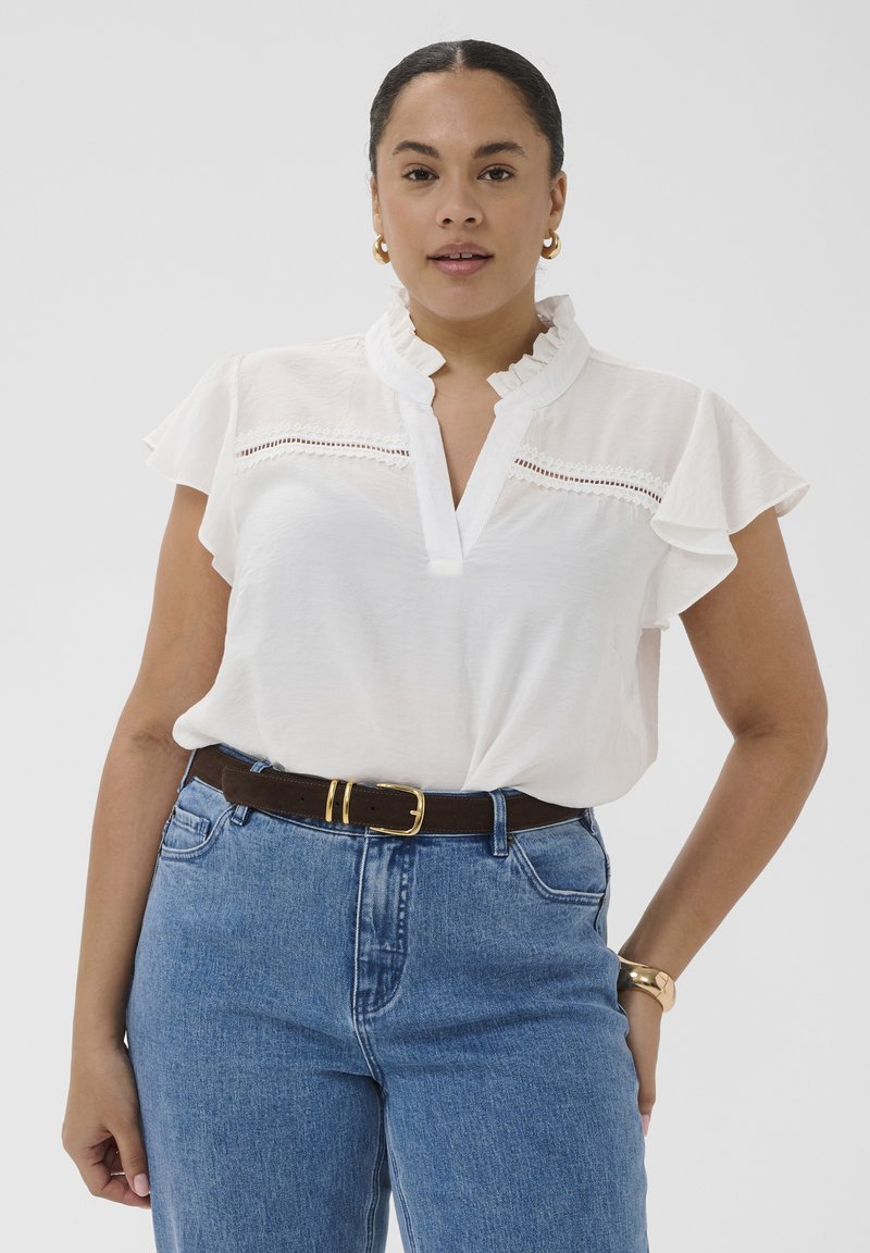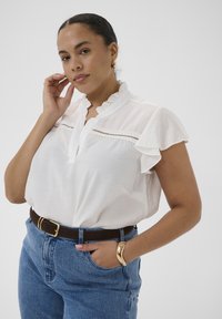 Femme portant un chemisier blanc à volants avec des détails en dentelle, un jean bleu, une ceinture marron, des boucles d'oreilles créoles dorées et un bracelet en or, debout devant un fond uni.