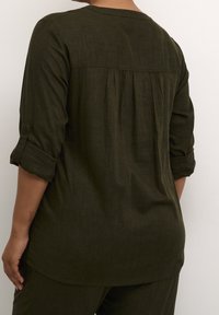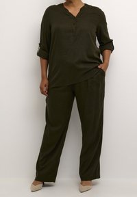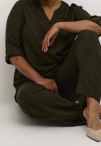 Personne portant une chemise boutonnée à manches longues vert foncé avec les manches remontées et un pantalon vert foncé assorti, debout contre un mur blanc.