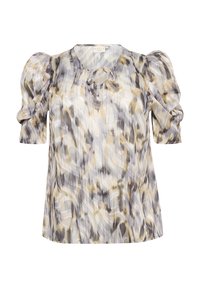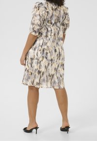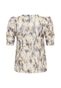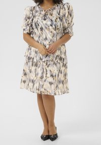 Femme portant une robe beige, grise et blanche à motifs, manches courtes bouffantes et col noué, les mains doucement jointes à la taille.